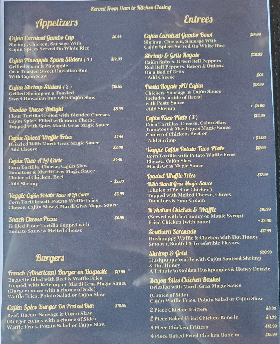 Corn tortilla with potato waffle fries & cheese, Cajun slaw, remoulade sauce.